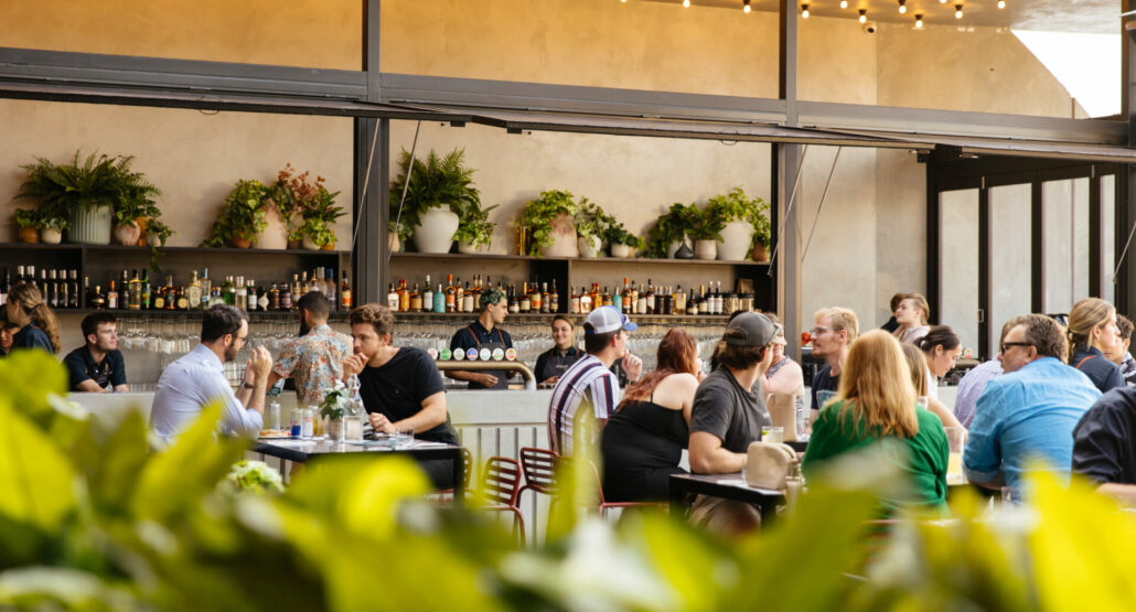 The venue features several unique spaces including a bright and airy rooftop bar, family-friendly courtyard, intimate evening nook, and the character-filled Grevillea room with a private bar for exclusive functions.